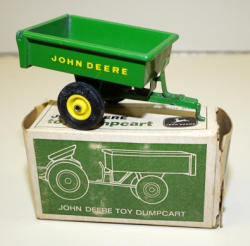 1/2-yellow seat tractor and near mint original; Trailer is about 95% with some play wear and a little darker green; boxes both have torn flaps and wear, boxes rate 7 condition; sells as a set for one money