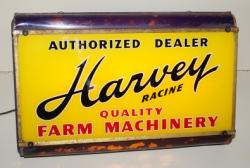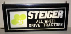 16"x35"x6", original plastic face & steel can, very clean and nice; great smaller size; came from the Vern Eymann Estate of North Dakota, never sold or seen this particular Steiger sign!