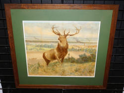 30"x33", early original JD Print with "Deere & Co." on the roof of the factory in the background and a Sulky plow being pulled too; print is 20"x23", has a spot of damage right in the middle of the deer's neck, some discoloration from age, overall still nice and nicely framed in a modern frame & mat