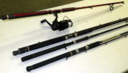 reel is in usable condition; rods are all nice shape; Shakespeare Firebird 7'6"; Browning Sila-Flex 10'; Daiwa Black Widow 8'6" & Cabela's TXS 8'6" (does not come apart; sell for one money; NO SHIPPING, local pickup only