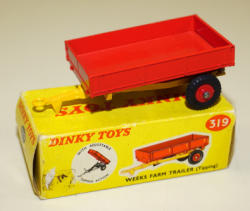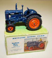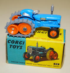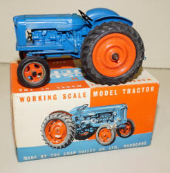 1/12th scale, 1950's plastic toy, near mint original, has 3pt with drawbar, tiny hairline crack in one rear rim; box is the dark blue version, has the box liner, some minor edge wear, but overall box rates 8.25 condition