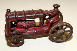Tin seat, cast-in drawbar, and solid rubber wheels version, no paint wear, but looks like the casting may be starting to crack from age; box is missing 2 inside flaps and has heavy wear, box rates 6.5 condition; no perfect, but a seldom seen piece in any condition