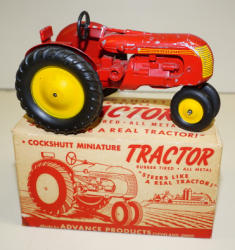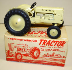 Tractor has square cast-in seat, solid rubber wheels, lights & belt pulley; missing the swinging hitch, paint overall is 90%, box is complete and square, some discoloration from age, but overall rates 8.5 condition, not perfect, but a pretty rare Cockshutt toy