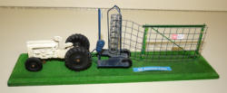 1/16th scale, all scratch built from steel, has two toggle switches on the side console that make the reel spin and drives the tractor; batteries are weak, but it does work, very cool piece, don't know the builder