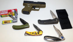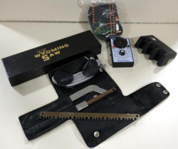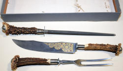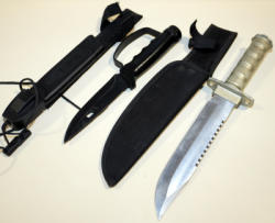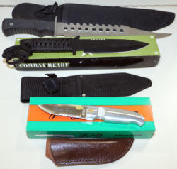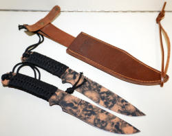 sheath is marked Legacy, not positive that the knives are that brand; rope covered grips; cool graphics; 6.25" blade;