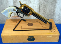 4.75" Gold finish Barrel; white mother of pearl style grips; mint & unfired; wood fitted display box has some storage wear; USA; SN#6185NEB; A-204