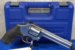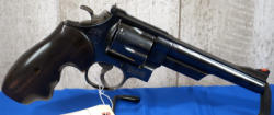 6" Stainless Barrel; rubber finger groove grips; red ramp front sight w/rear white outline; 6-shot swing out cylinder; factory hard case; used but very clean; USA; SN#CXU8153; A-183