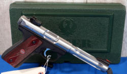 5" Stainless Barrel; hard rubber textured grips; hy-vis front sight w/rear night sights; factory hard case; fired but like new condition; USA; SN#KF138706; A-205
