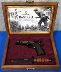 4-3/8" BBL; wood checkered grips; highly engraved slide w/gold lettering; wood display box w/war scenes on inside lid and fitted for gun & K-Bar Knife; includes soft zippered case; great piece! USA; SN#2011220603; A-196
