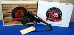 4.75" Tapered BBL; black checkered plastic grips w/red eagle logo; has factory wood box w/cardboard sleeve; 2-magazines; mint & unfired; USA; SN#70TH-00400; A-196