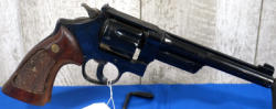 6" BBL; very nice bluing; red ramp front sight w/rear white outline; custom finger groove wooden grips; 6-shot swing out cylinder; nice condition; USA; SN#AJW1645; A-194