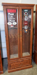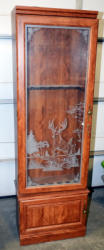 deep for scoped rifles; has Whitetail deer graphics on glass door; bottom storage; has key; nice shape; 72"x22"x11"; NO SHIPPING, local pickup only
