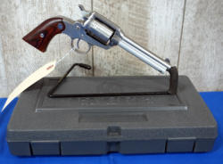 4" Stainless barrel; factory hard case; looks mint & unfired; wood grain laminate grips; factory engraved fixed 6-shot cylinder; USA; SN#93-46834; A-194