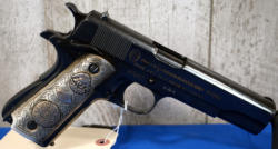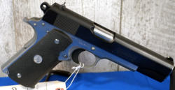 5" Stainless barrel; rubber Colt wrap around grips; night sights; stainless frame w/blued slide; very nice used condition; USA; SN#CG22001; A-194