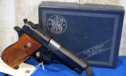 looks mint & unfired w/original factory box; 4" BBL; wood checkered grips; very nice S&W Pistol!; USA: SN#A282992; A-196
