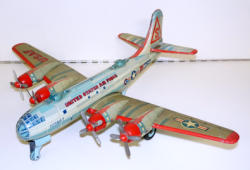 15" long, 20" wingspan, some discoloration on the wings, some paint loss on the tailfin, overall a good looking antique toy