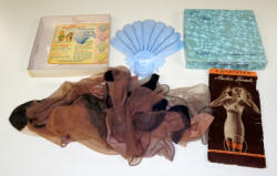 unique, 1950's era plastic holder with several unique sets of stockings; this was displayed in the Spomer Museum lady's room