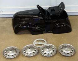 Body has been all restored to black, includes replacement rims and part of the pedal assembly, but it's not 100% complete, Marv thinks he has more parts to include, but hasn't found them yet, if he does, you'll get them