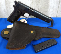 5-7/8" BBL; Lanyard loop, reblued over worn finish. Includes a period correct Bauer Bros. leather drop holster and 1 extra mag; plastic checkered Colt grips; fixed sights; has some pitting; USA; SN#30497; A-192