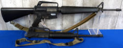 20" BBL; Without forward bolt assist (USAF M16 version) with thin "C MP C" marked barrel, triangular handguards, and early 3-bar flash suppressor.