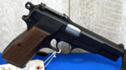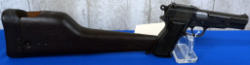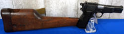 4.75" Stainless Barrel; Pre-War Belgian military, with tangent sight and cut in backstrap to accept a shoulder stock (not included). Overall black Cerakote refinish, import marked on bottom of the slide. Reproduction wood checkered grips; looks nice; Belgium; SN#20261; A-192