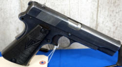 4.75" BBL; Black Checkered Bakelite grips, RA marked mag, SALtd 1945 holster stock w/ frog; bluing is thin; adjustable rear sight; Inglis, Canada; SN#2CH7905; A-192