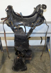 12" Seat; carbine scabbard; saddle bags; lots of brass; pretty dirty but would clean up nice; couldn't find a maker tag; has a US canteen;
