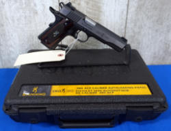 4.25" BBL; stainless slide; fancy checkered wood grips w/gold Browning logo; night sights; 2-magazines; factory hard case; looks fired but like new condition; USA; SN#51HZP02660; A-244