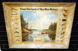 12"x20", lights up, the name plate is a reproduction and missing the frame, colors are lightly faded, going to need some finish work