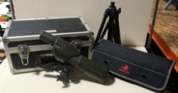 very clear, looks like it was hardly used; includes hard case (needs cleaning), soft case & tripod