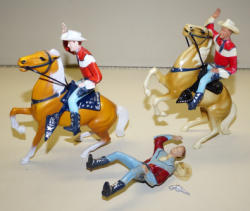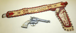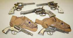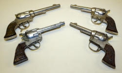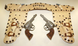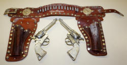 9" matching RR's guns work, correct guns for this set with the copper colored grips, nice older set, includes the two mini-guns in the belt too! Neat set