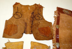 matching 9" guns work, but both have quite a bit of paly wear, heavy leather holster with plastic bullets and heavy metal tacks & decoration, has some general wear