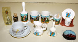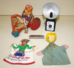 one cast iron is damaged, 2 tin, 2 plastic, one black metal, all tog o