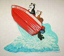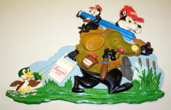 Approx. 8"x26" logo sign, has a few small cracks that have been taped or glued, unique with the duck tied to it