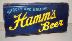 14"x21", lights up and works, Same art as the TV Rippler, same case as the blue glass signs, but this was a factory made sign by Hamm's and seldom scene, some general wear