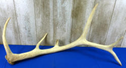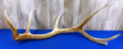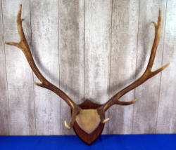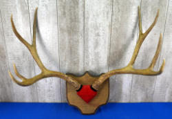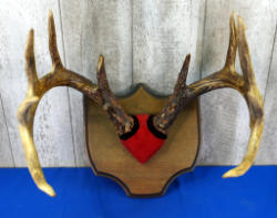 nice thick bases; mounted to wood w/felt wrap; small point on bottom of left antler to make it a 7x6; approx. 18" spread