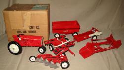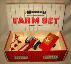 Very scarce. Includes a Farmall C, 4-wheel trailer, driver, and Flarebox wagon. Toys are all near mint except steering wheel is broken. Tractor is 4" long. Box is very nice and has great graphics. Overall box rates 8.75 condition. Awesome