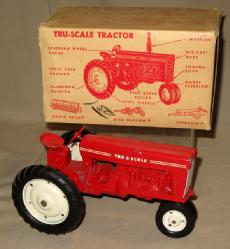 WOW, what a set! Very unusual, contains a IH 544, Oliver 3b Plow, Red Single Gang Disc, and plastic-rim Stepside trailer. Toys are all near mint, but tractor halves are separating some. Original bubble is still attached, but torn, very short production when Ertl/Tru-scale merged!