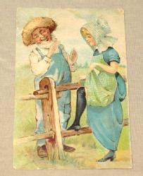 4.75"x3", lady folds out to reveal a young man, nice DAIN advertising on reverse side, has some light wear