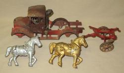 Truck has a broken frame, plow has damage, horses look good, one money buys the box full