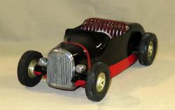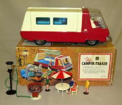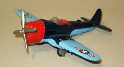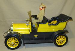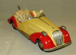 Tin & plastic, front wheel is damaged, about 16" long, box has some wear
