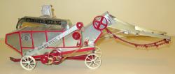very nice thresher, one wheel has some damage, but looks fixable, about 1/16th scale, mostly wood with some metal parts