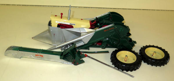Spec Cast Tractor, Plastic 2-row picker repainted to New Idea, back axle is off and needs a little work,