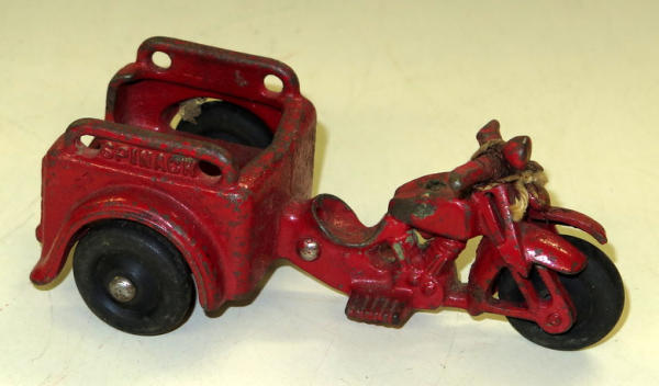 5.5" long, original paint, it is cracked at the handle bars and does not have the Popeye figurine; has "Spinach" Cast into the sides