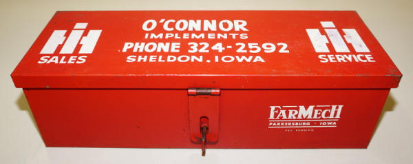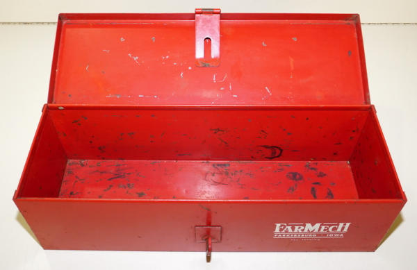 18"x6"x5.5", really clean and nice; has been used, some wear to the inside and to the edges, but lettering is strong; one of the best looking FarMech tool boxes we have sold