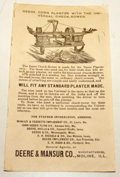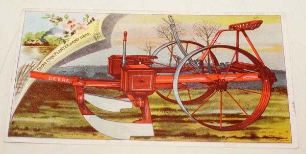 6"x3.25", good color, shows the early planter, back graphic even shows the Round Deere & Mansur cast iron seat