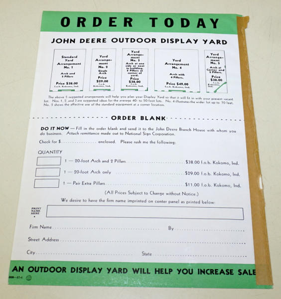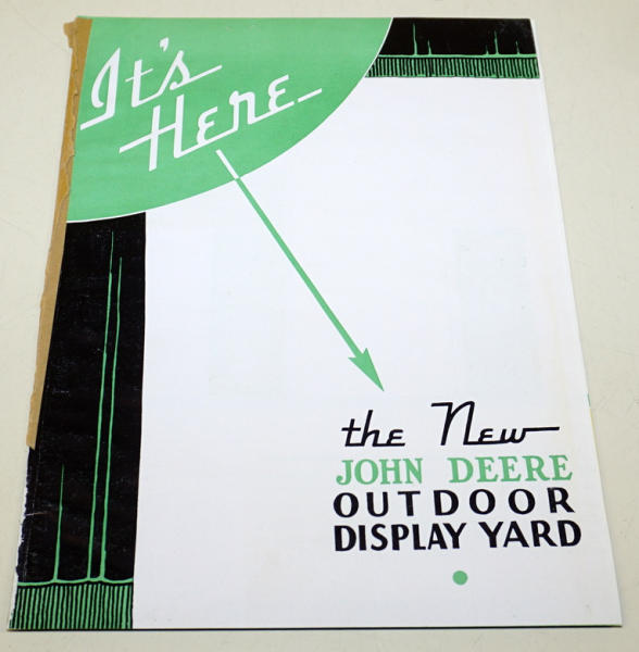 208-37-6, 4 pages, looks like it was removed from a larger book, has some tape on the spine; opens up to show the really colorful outdoor display that JD dealers could order for fairs and such, neat piece, slightly trimmed, missing part of the date code