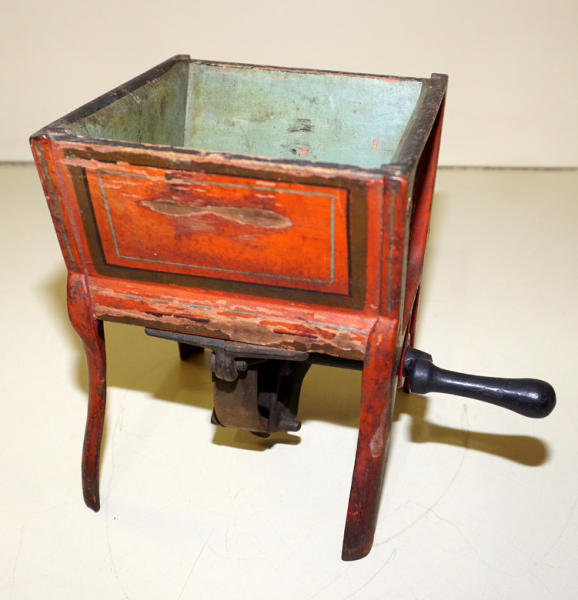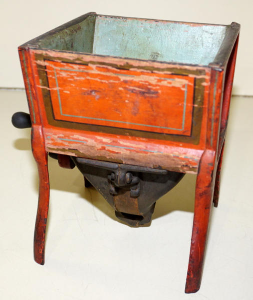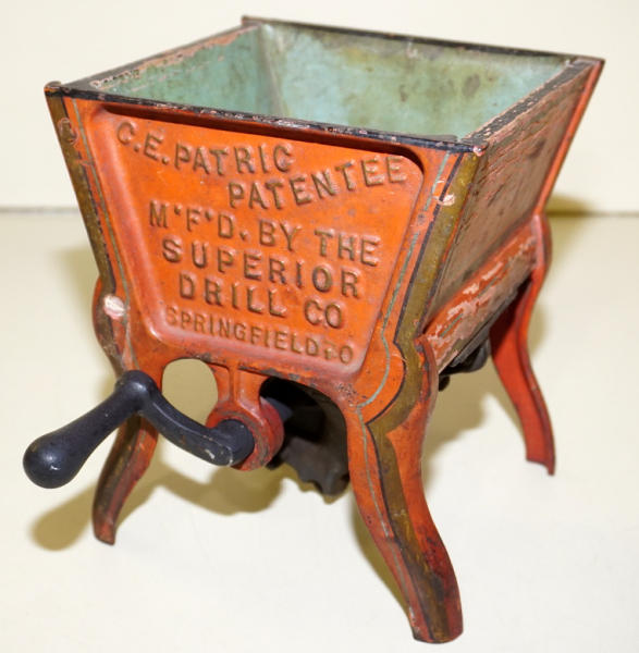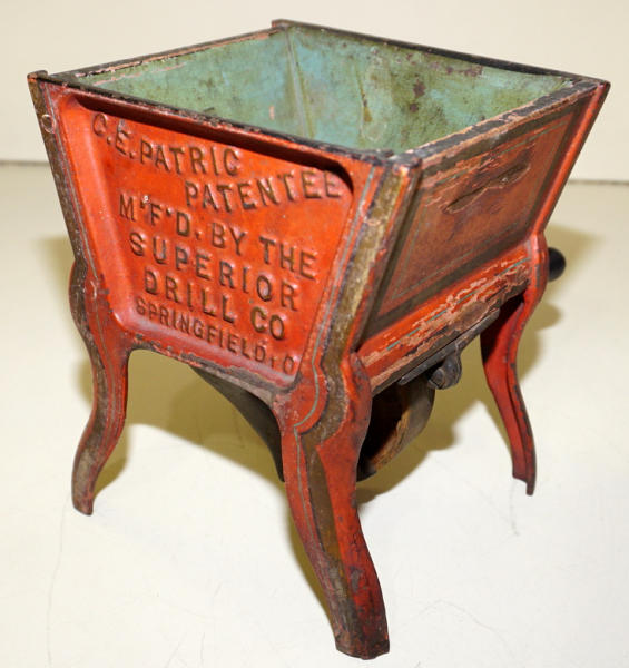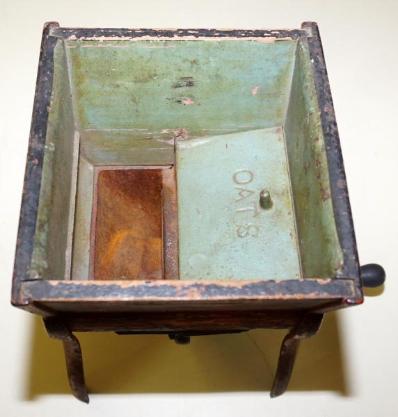 Great piece, cast iron ends with wood sides, has a cast iron door inside to switch the drill from WHEAT to OATS; 7.5" tall, 6"x6" square; original paint is a little faded and worn, but still a great patina;