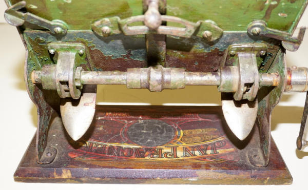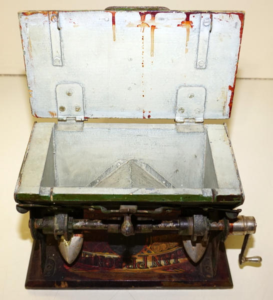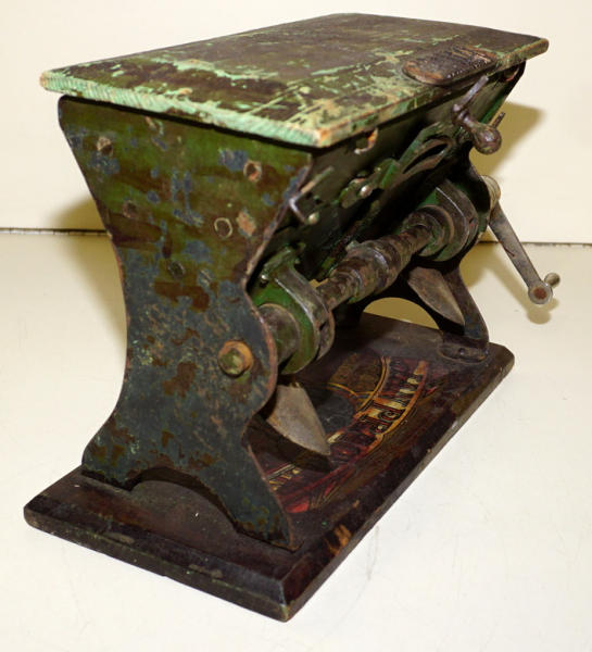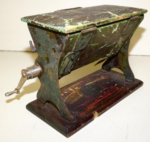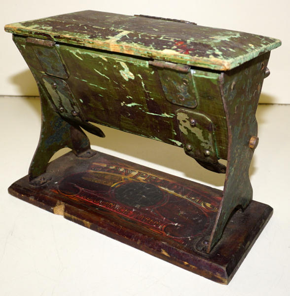 another neat piece, 12" wide, 9" tall, 6" wide; original paint is worn; has an original label on the base, but I can't make out the works, looks like it might be foreign made, unique piece