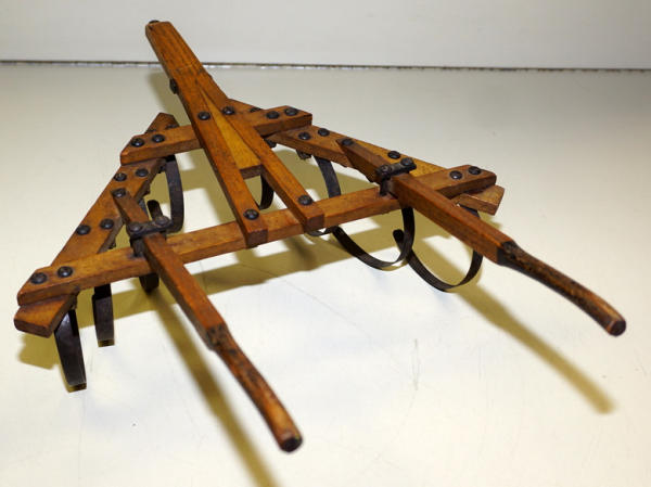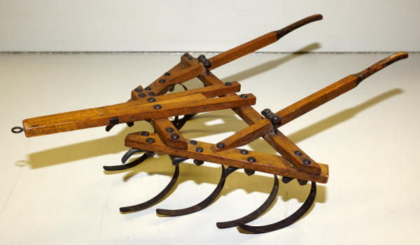 17" long, 12" wide, great original patina, sweeps are tin, rest is wood, no makers mark, nice piece